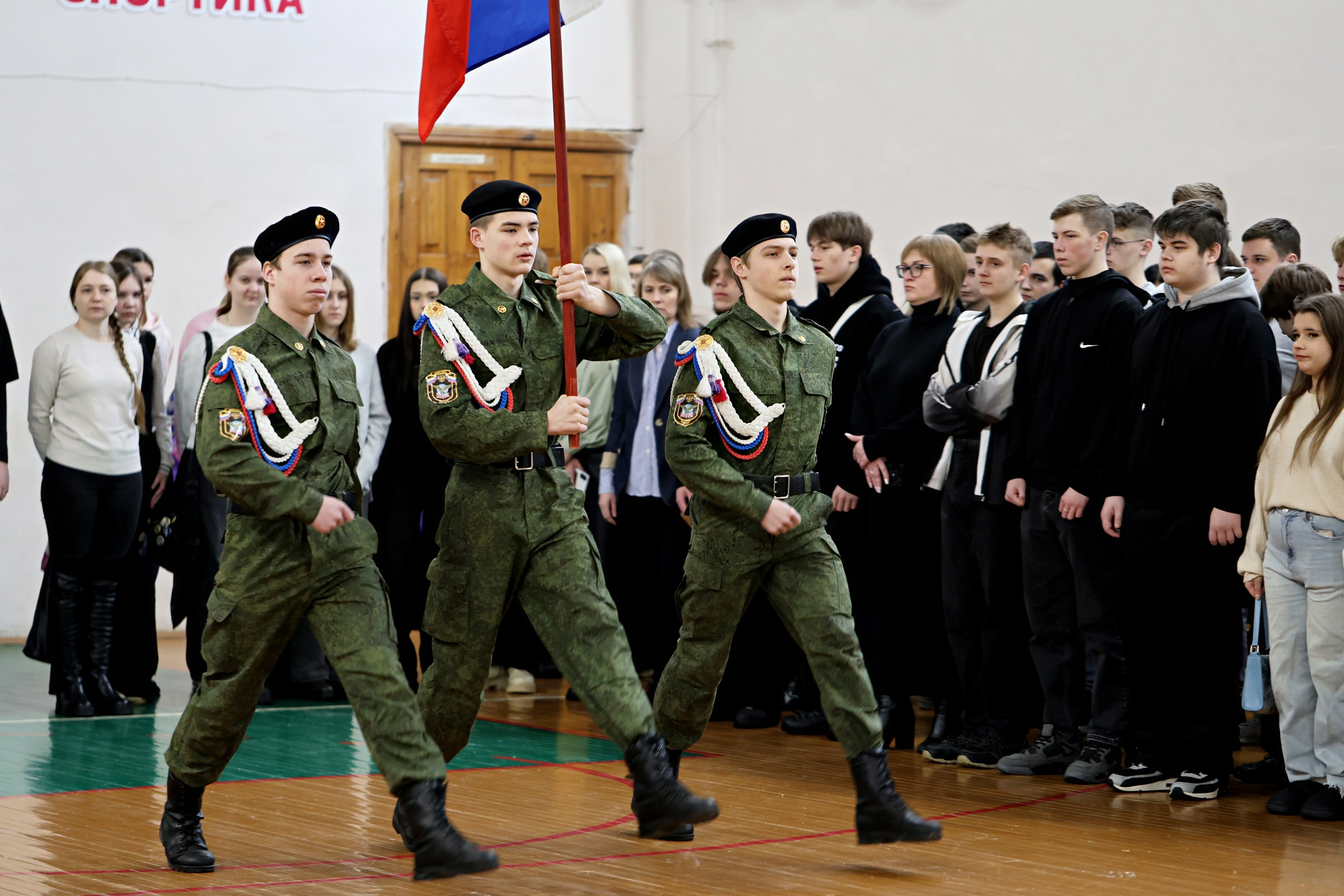 2 марта в Арзамасском коммерческо-техническом техникуме прошла ежемесячная торжественная линейка. Право вынести государственный флаг Российской Федерации было предоставлено студентам техникума, участникам творческого объединения допризывной подготовки «Сколот»: